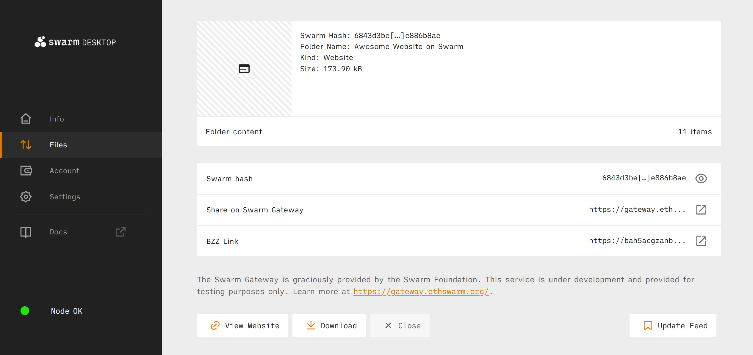On the following screen you will see the data associated with the Swarm hash and see options for downloading (or browsing if it is a hash for a website):