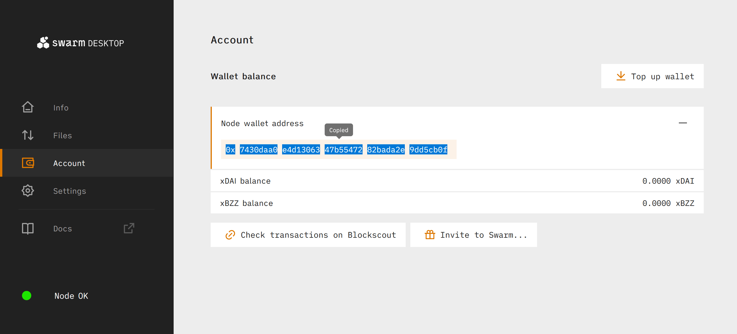 Once you have a few xDAI in your Gnosis Chain address, to fund your Bee node you need to send it from your wallet to your Swarm Desktop wallet. You can find your address from the Account tab of the app.